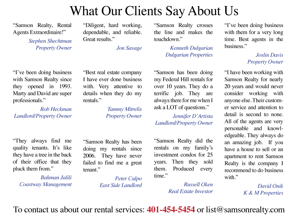 Specializing in Rentals and Sales of Residential Properties on the East Side of Providence, RI and Surrounding Areas. Rental Management Services. Near Brown University and RISD. Sales and Rentals of Single Family and Multi-Family Homes, Condominiums, & Apartments. Unfurnished and Furnished.